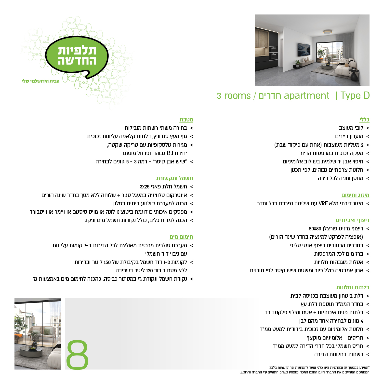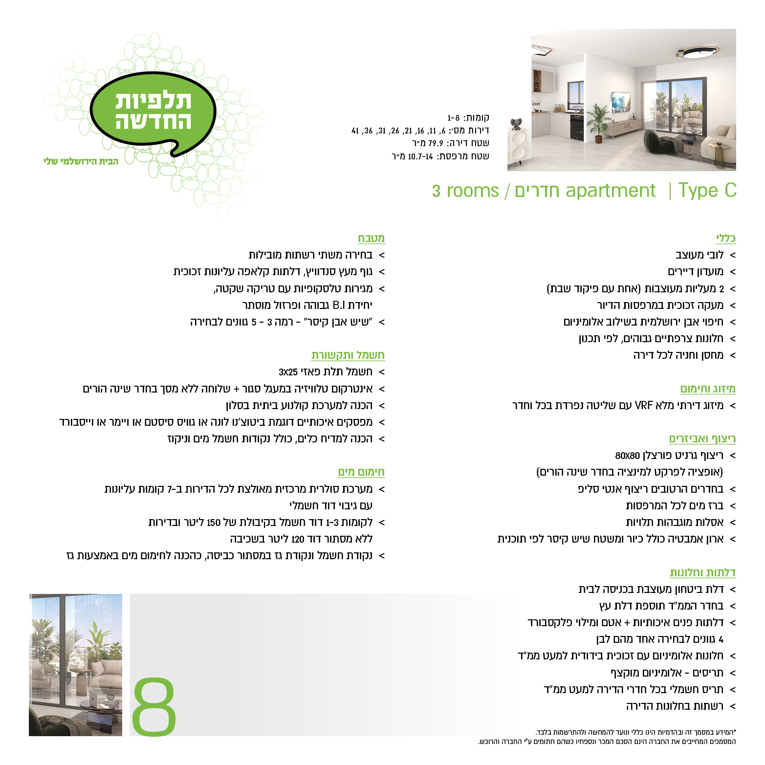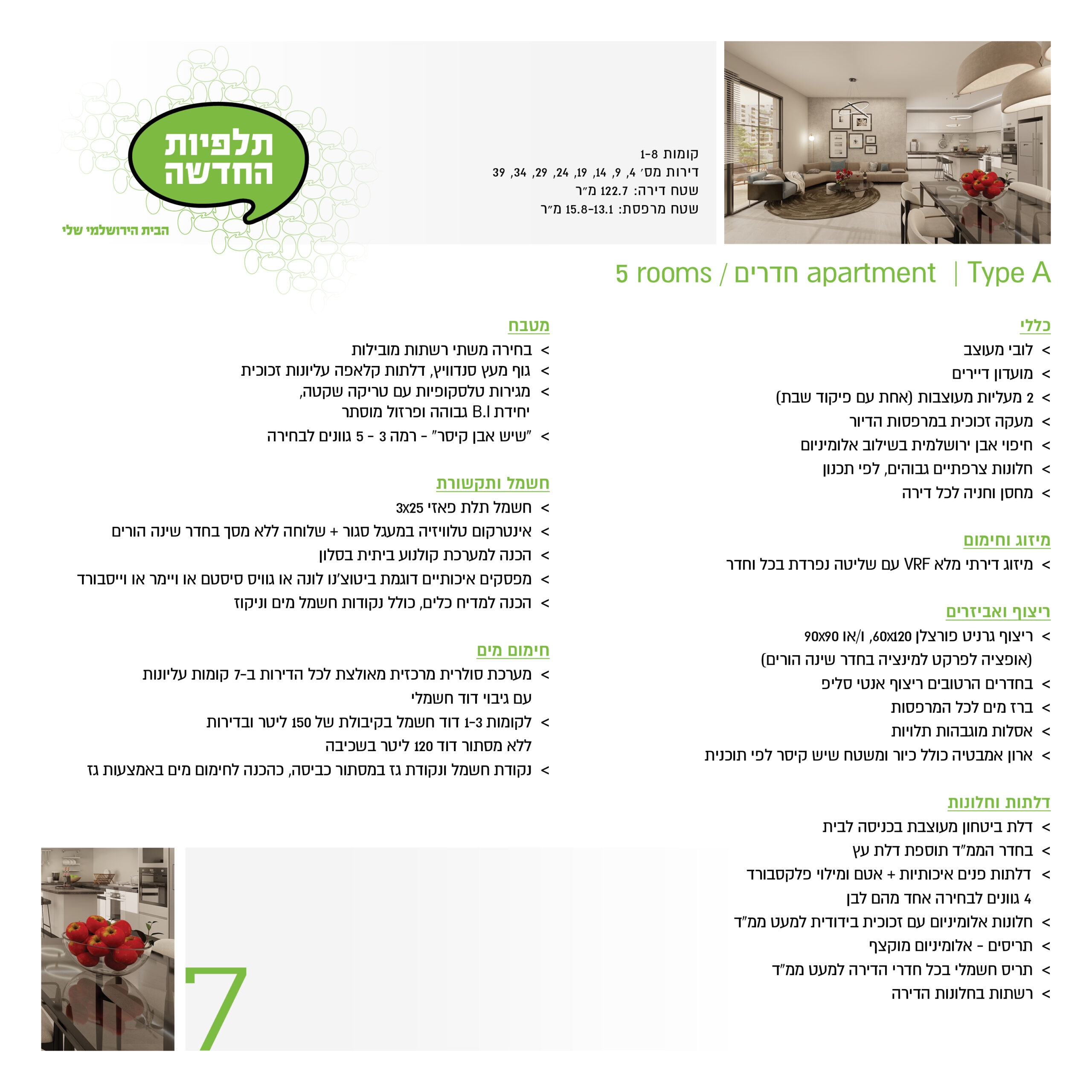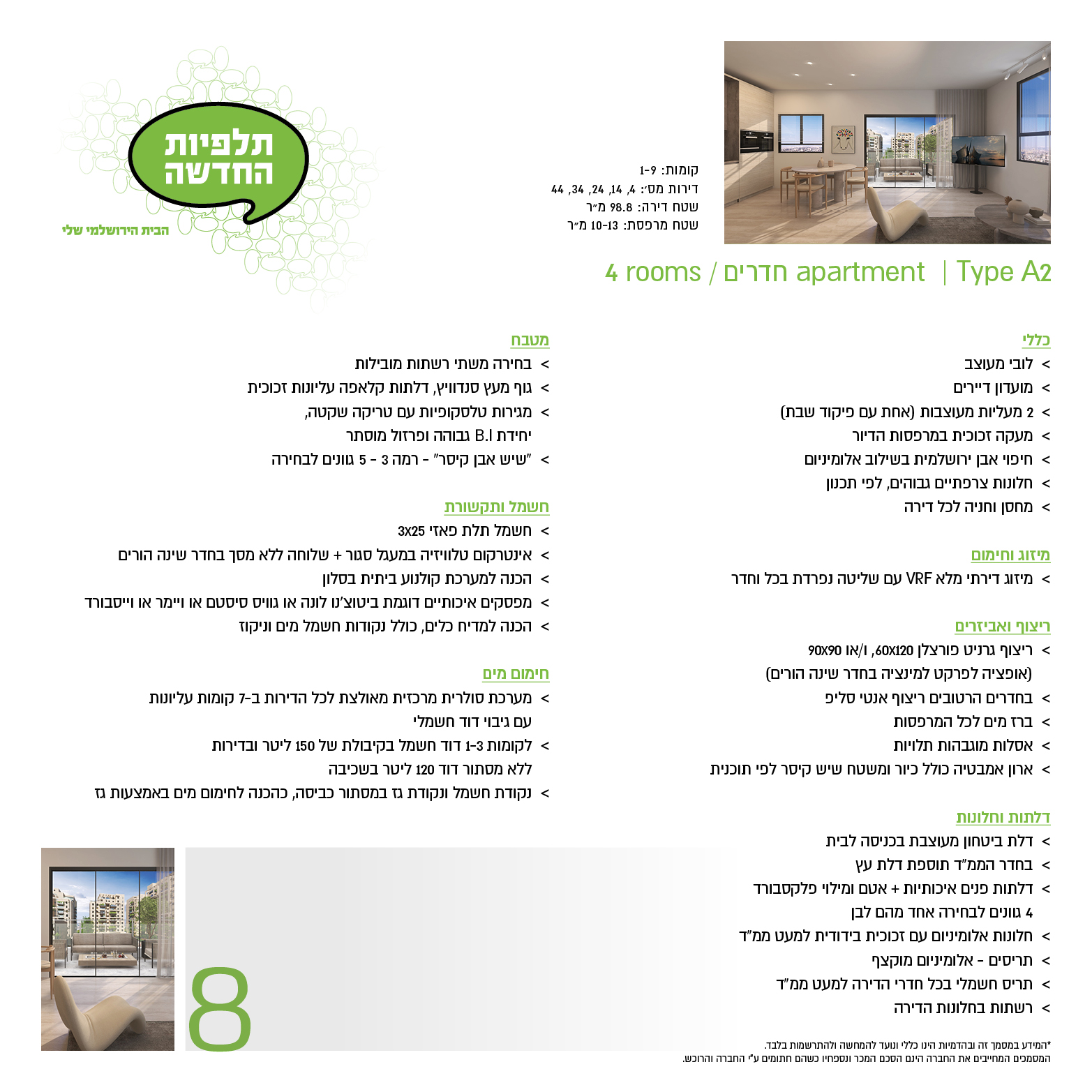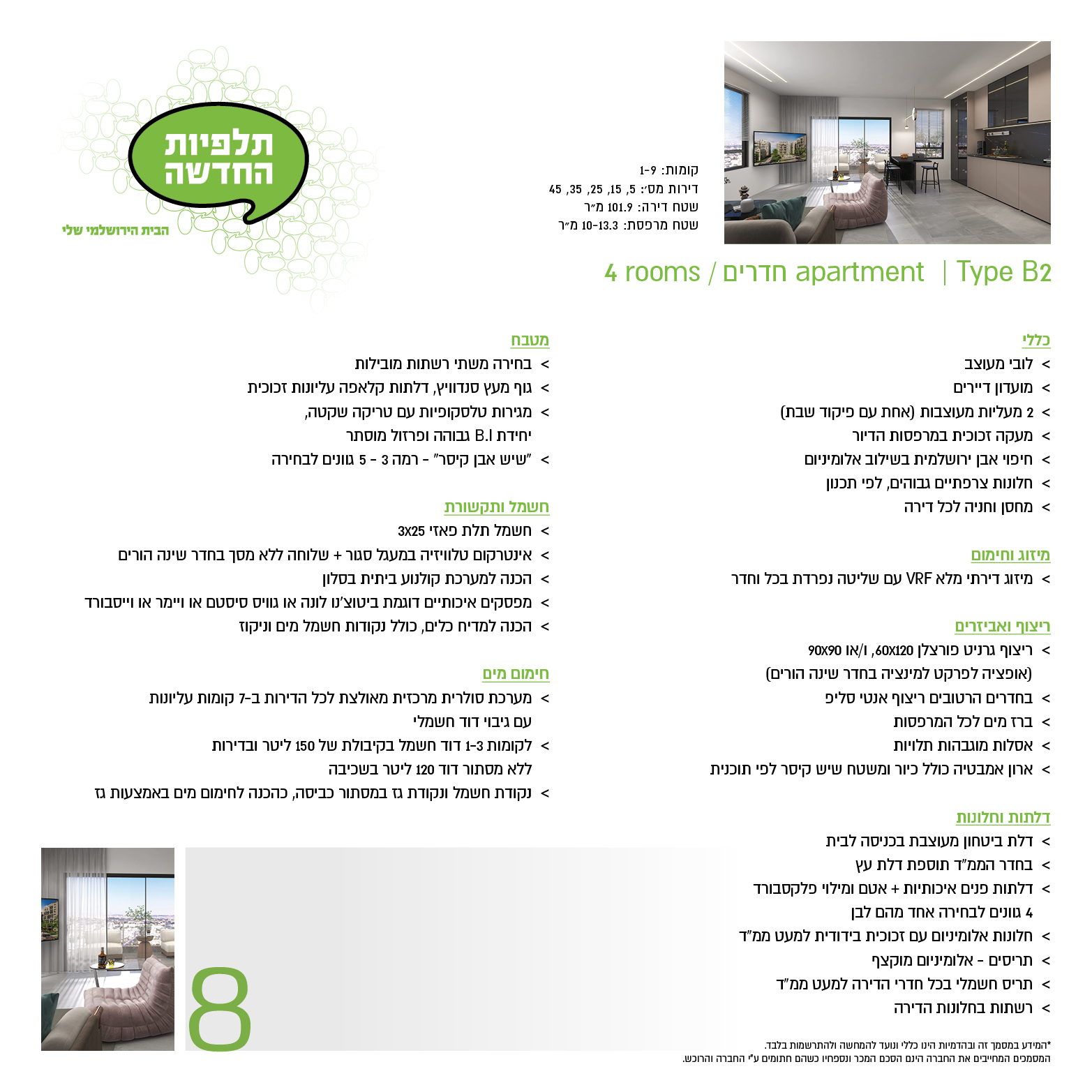 אנו שמחים להזמין אתכם להצטרף לפרויקט תלפיות החדשה שלב ב', שתוכנן ע"י משרד אדריכלים בינלאומי מן שנער ולהצטרף לקהילת דיירים איכותית ומגובשת המתגוררת בשלב א' של הפרויקט. דיירי הפרויקט יהנו מלובי מפואר שעוצב ע"י אדריכל בינלאומי ניר פורטל, חניה מקורה, ומחסנים. בלב הפרויקט יוקם פארק ירוק הכולל מתקני משחקים, וכן STREET MALL יוקרתי. בפרויקט 8 בניינים מרהיבים ובהן דירות 2-5 חד', דירות גן, מיני פנטהאוזים, פנטהאוזים, 4 בניינים בשלב א' כבר אוכלסו, שלבב' של הפרויקט 2 בניינים – עכשיו בשיווק.