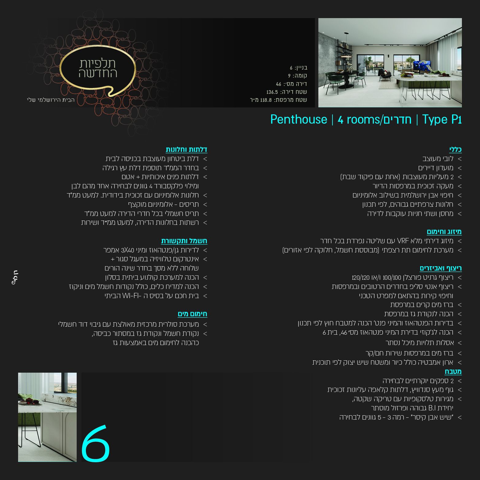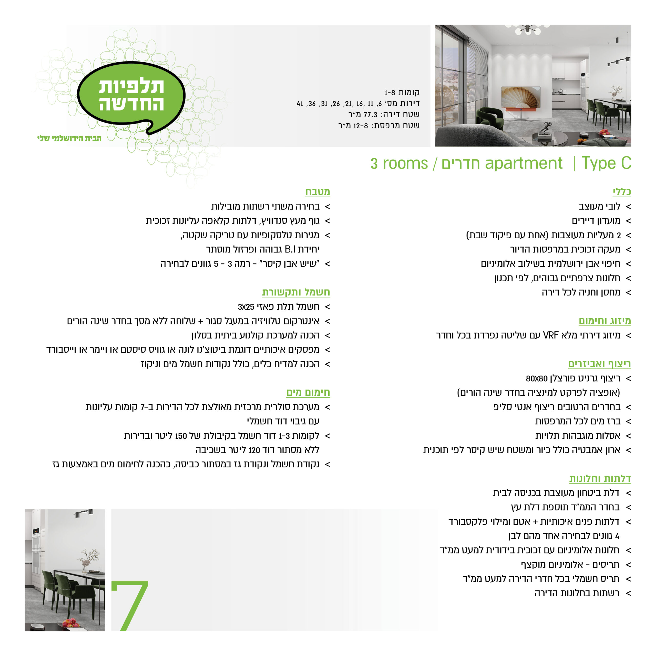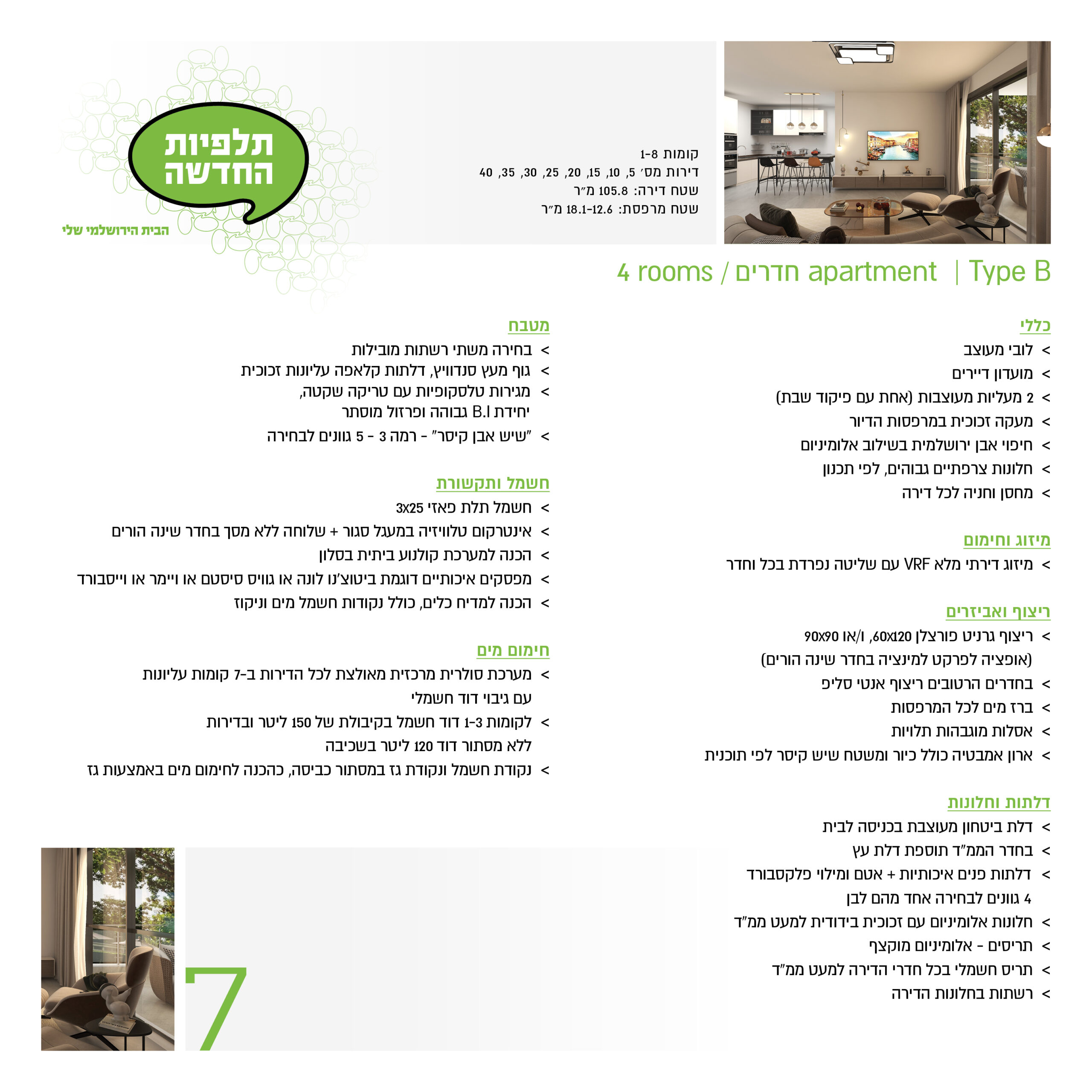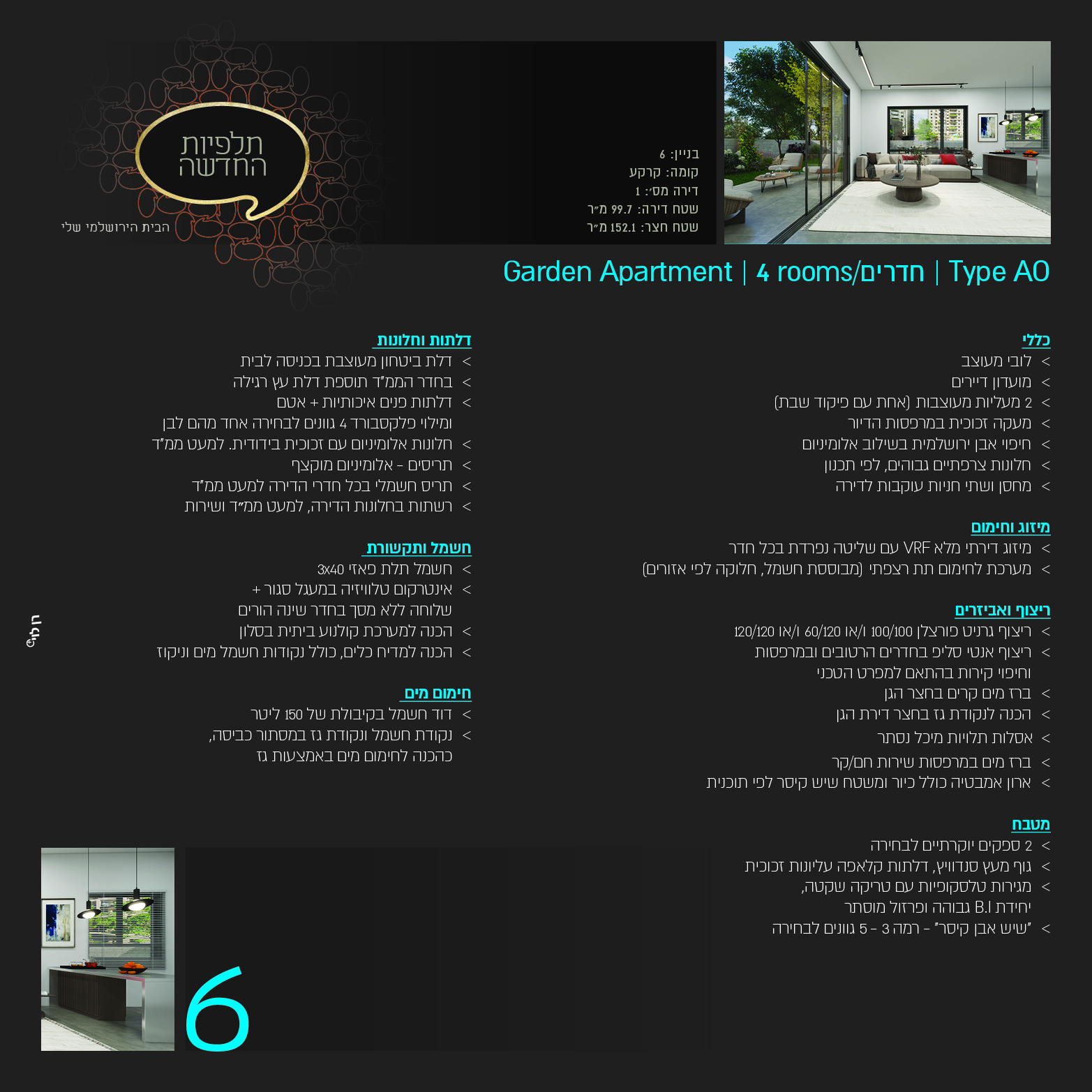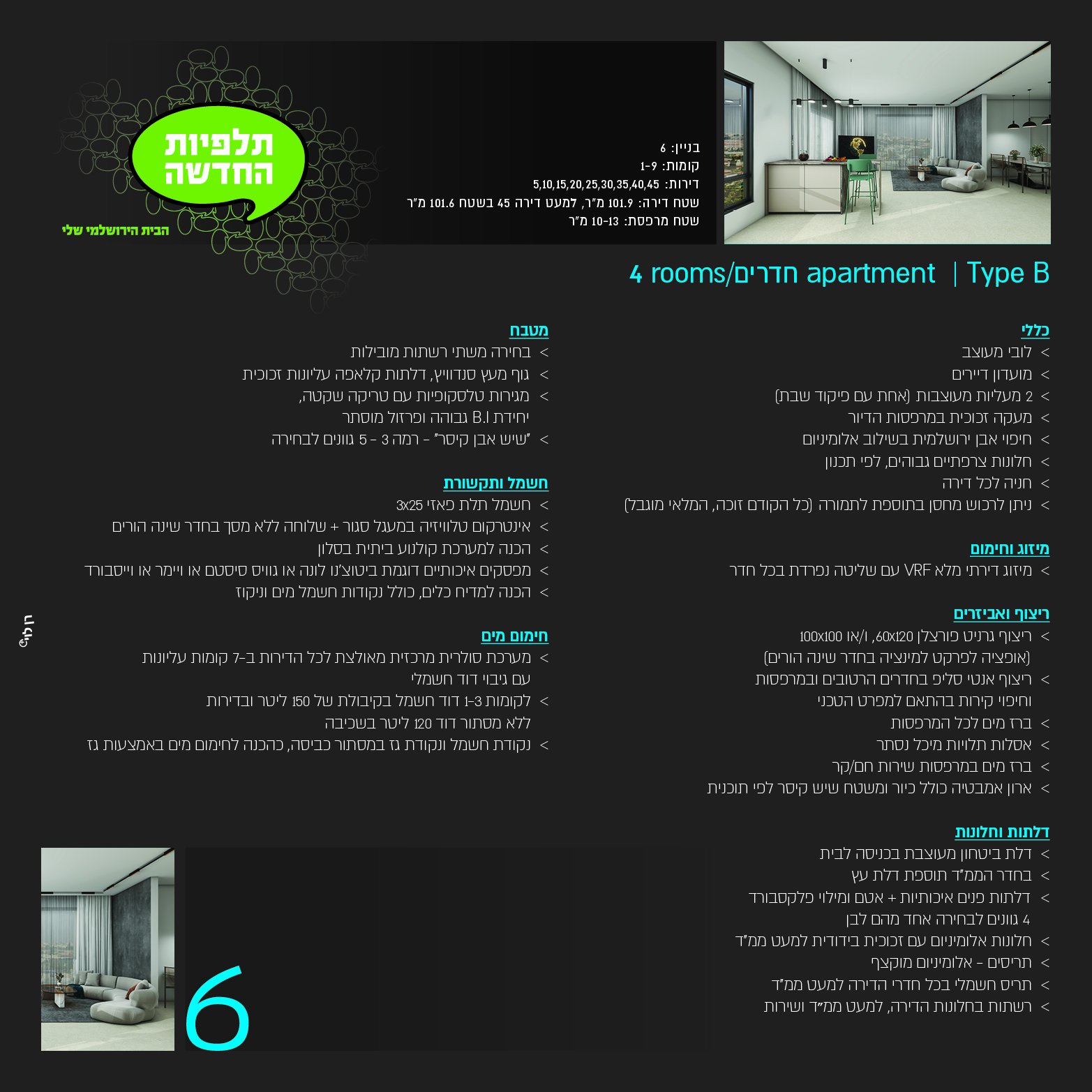 אנו שמחים להזמין אתכם להצטרף לפרויקט תלפיות החדשה שלב ב', שתוכנן ע"י משרד אדריכלים בינלאומי מן שנער ולהצטרף לקהילת דיירים איכותית ומגובשת המתגוררת בשלב א' של הפרויקט. דיירי הפרויקט יהנו מלובי מפואר שעוצב ע"י אדריכל בינלאומי ניר פורטל, חניה מקורה, ומחסנים. בלב הפרויקט יוקם פארק ירוק הכולל מתקני משחקים, וכן STREET MALL יוקרתי. בפרויקט 8 בניינים מרהיבים ובהן דירות 2-5 חד', דירות גן, מיני פנטהאוזים, פנטהאוזים, 4 בניינים בשלב א' כבר אוכלסו, שלבב' של הפרויקט 2 בניינים – עכשיו בשיווק.