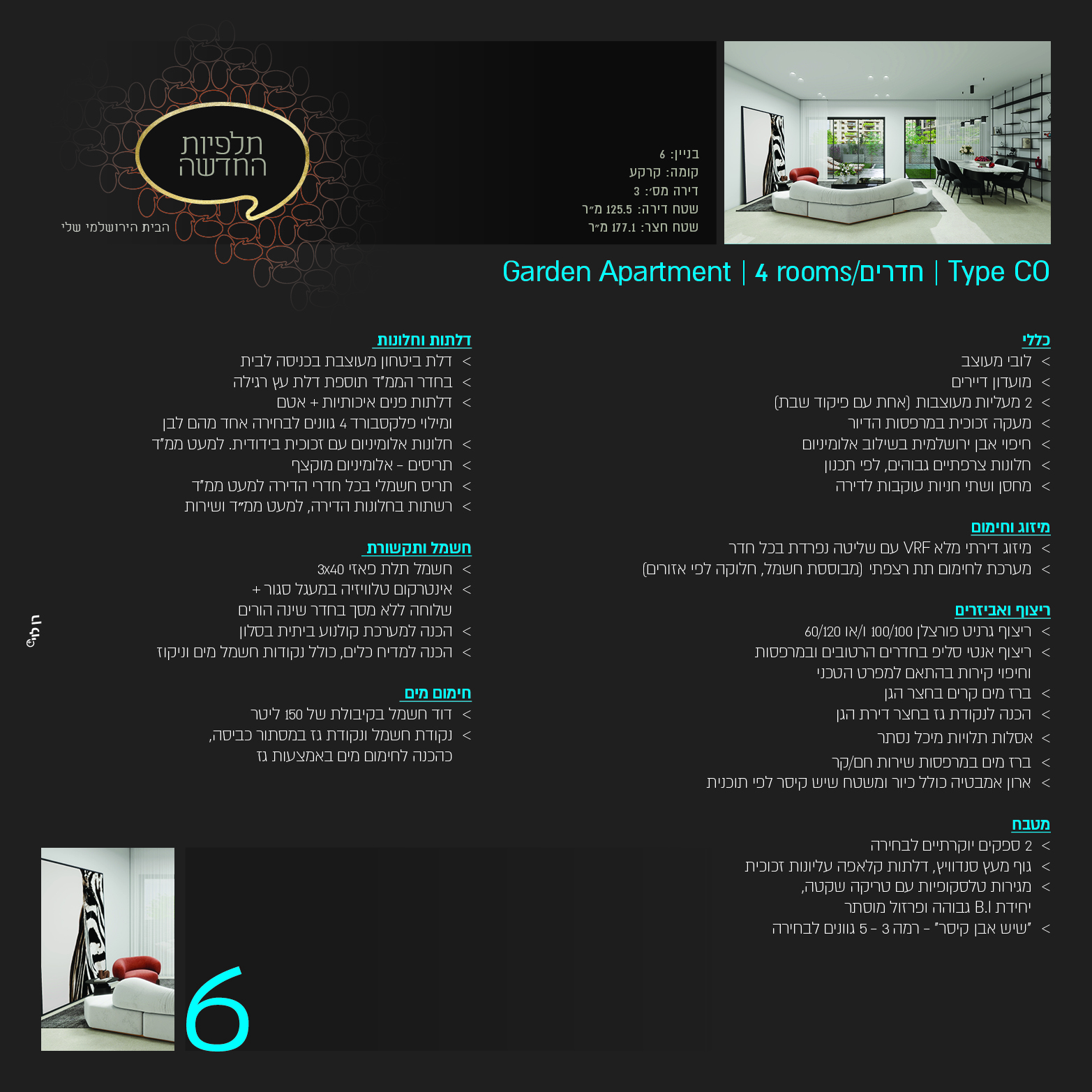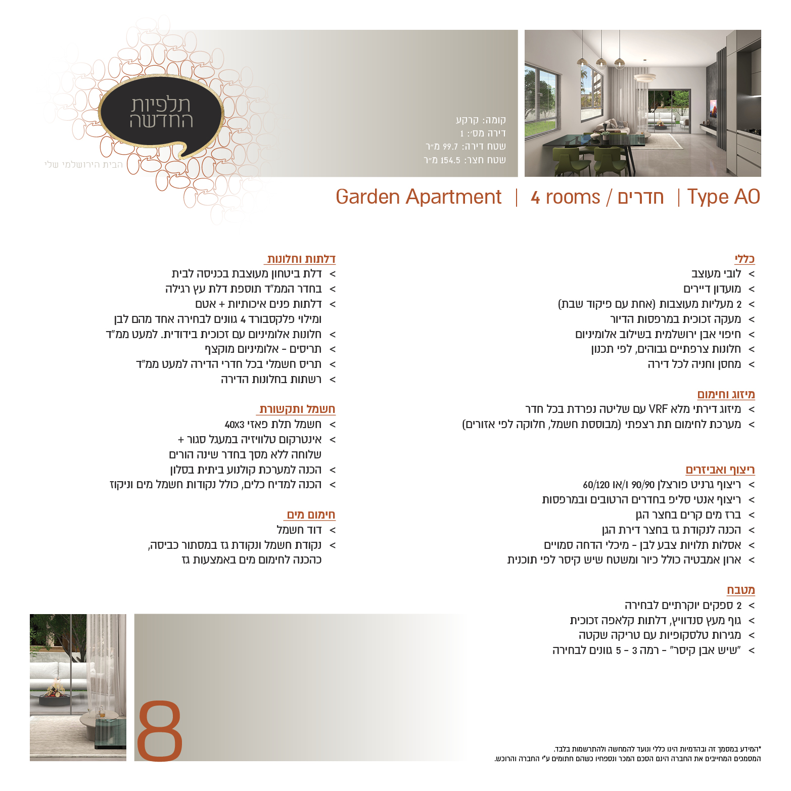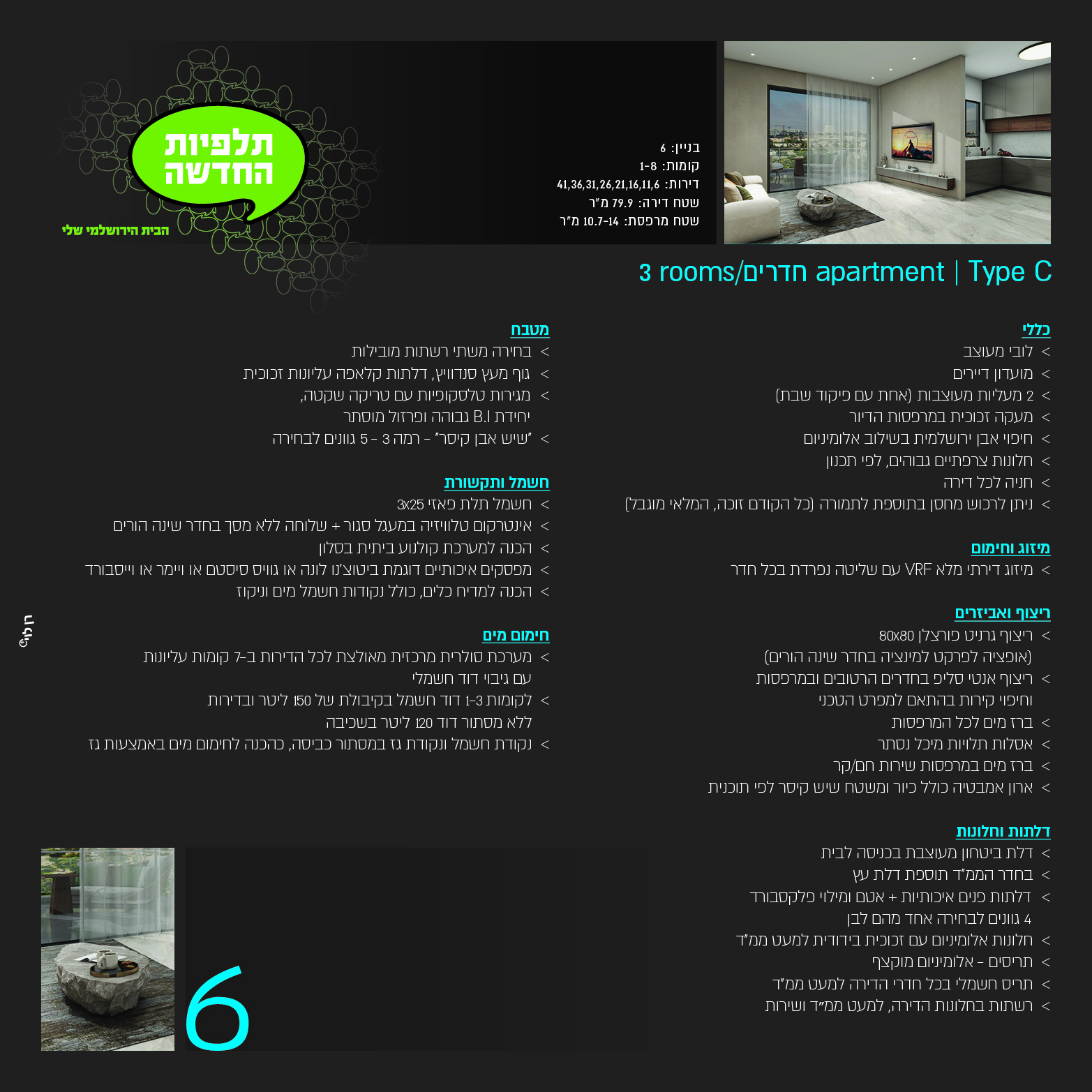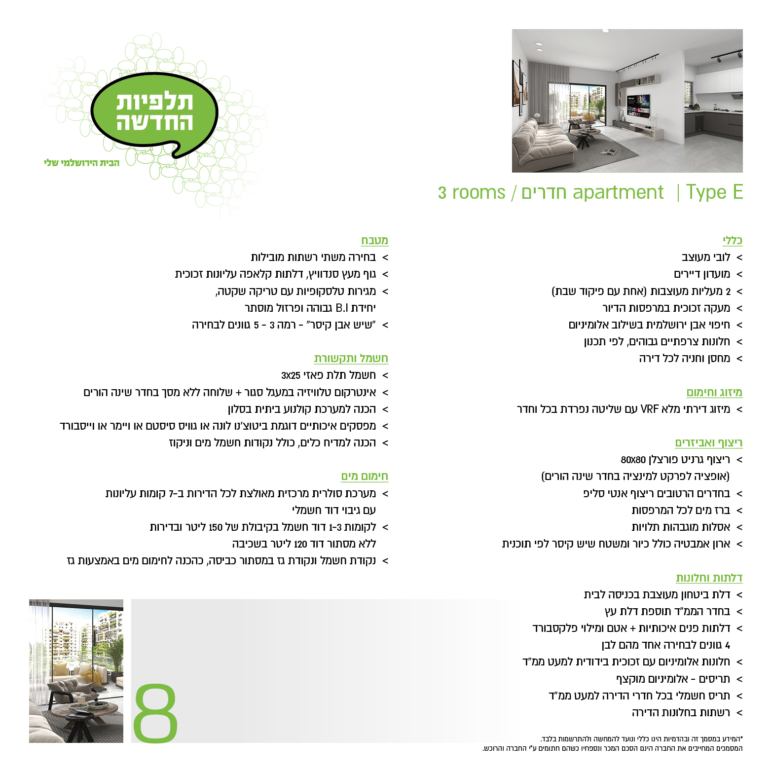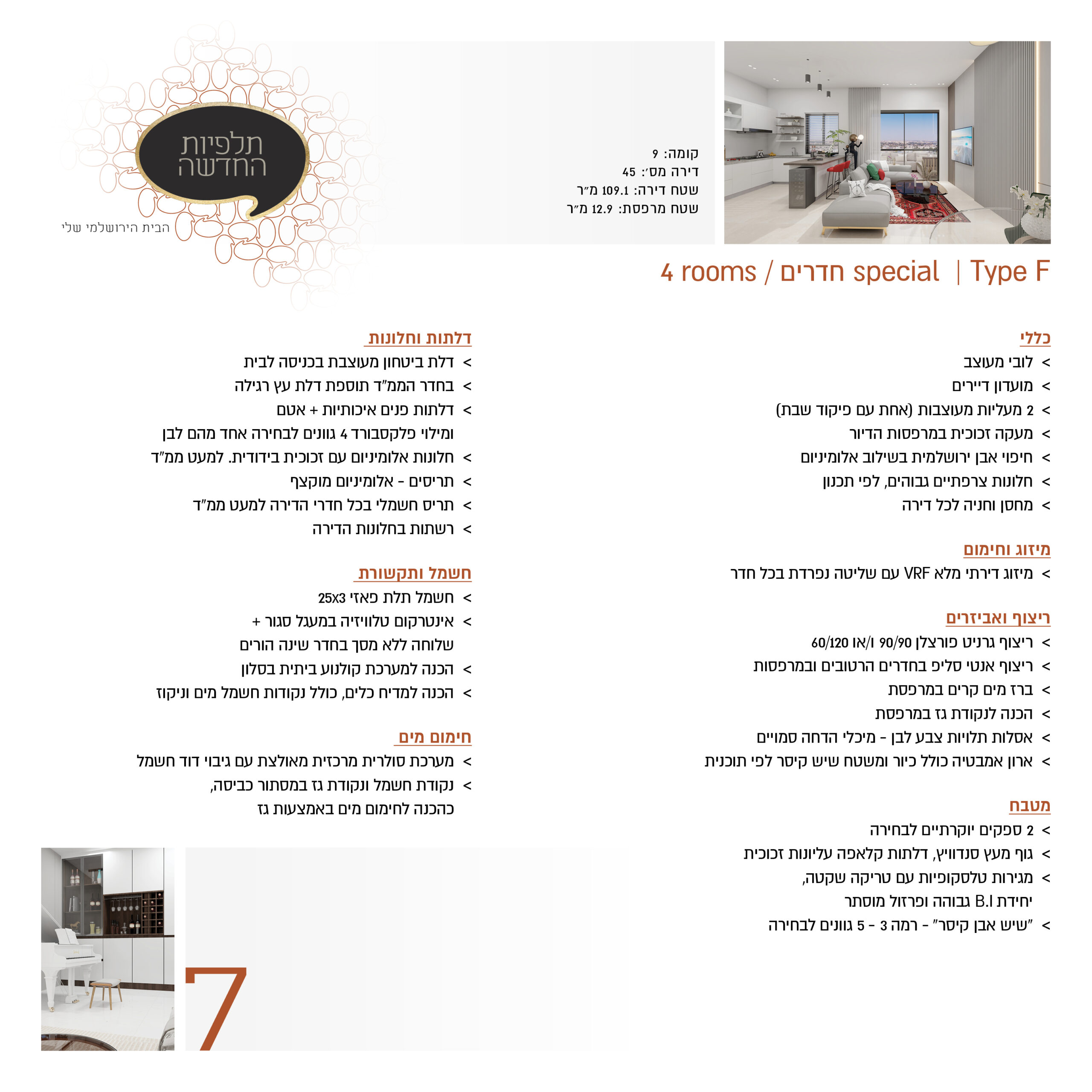 אנו שמחים להזמין אתכם להצטרף לפרויקט תלפיות החדשה שלב ב', שתוכנן ע"י משרד אדריכלים בינלאומי מן שנער ולהצטרף לקהילת דיירים איכותית ומגובשת המתגוררת בשלב א' של הפרויקט. דיירי הפרויקט יהנו מלובי מפואר שעוצב ע"י אדריכל בינלאומי ניר פורטל, חניה מקורה, ומחסנים. בלב הפרויקט יוקם פארק ירוק הכולל מתקני משחקים, וכן STREET MALL יוקרתי. בפרויקט 8 בניינים מרהיבים ובהן דירות 2-5 חד', דירות גן, מיני פנטהאוזים, פנטהאוזים, 4 בניינים בשלב א' כבר אוכלסו, שלבב' של הפרויקט 2 בניינים – עכשיו בשיווק.
