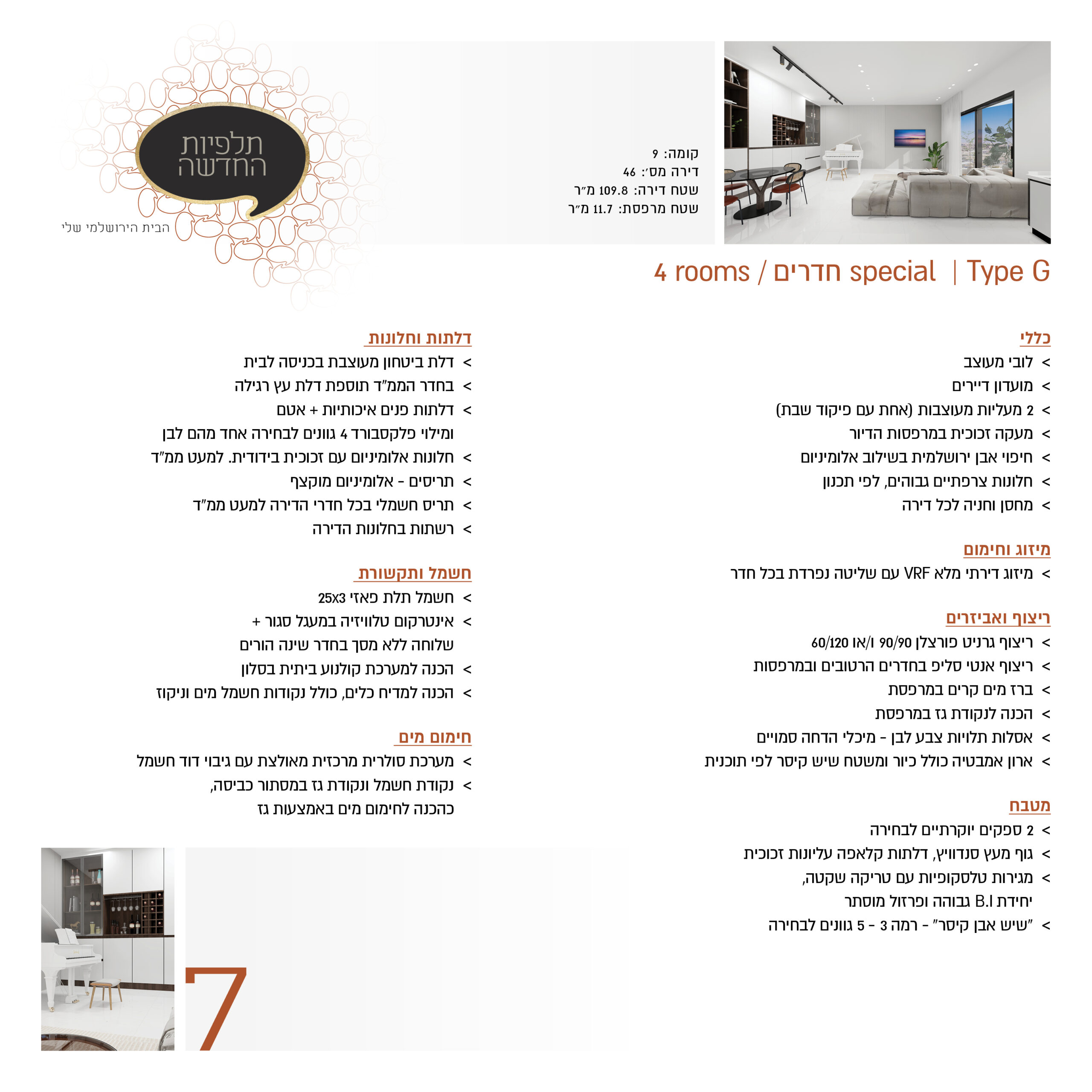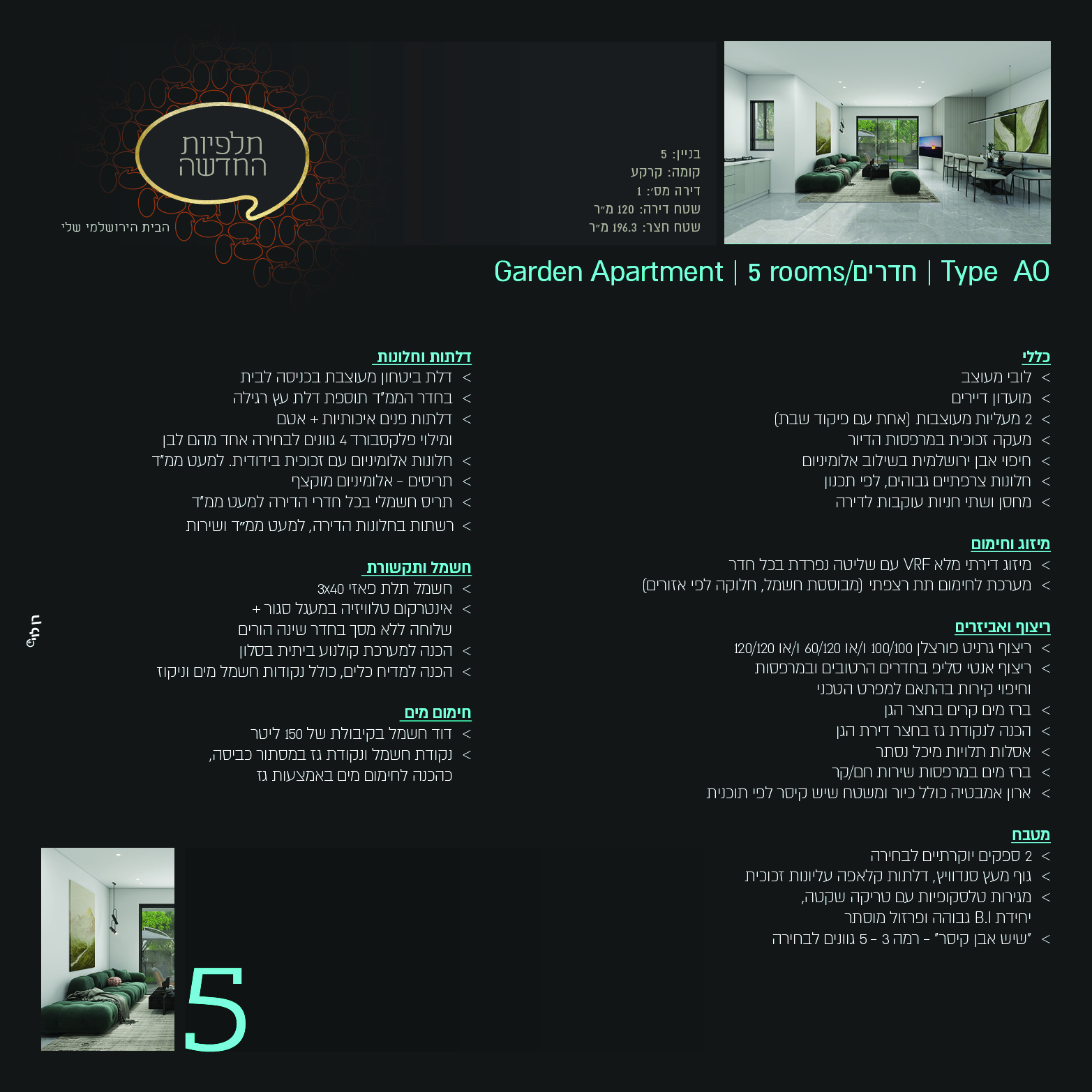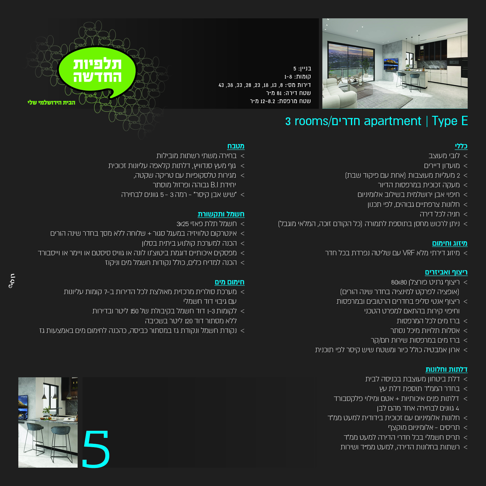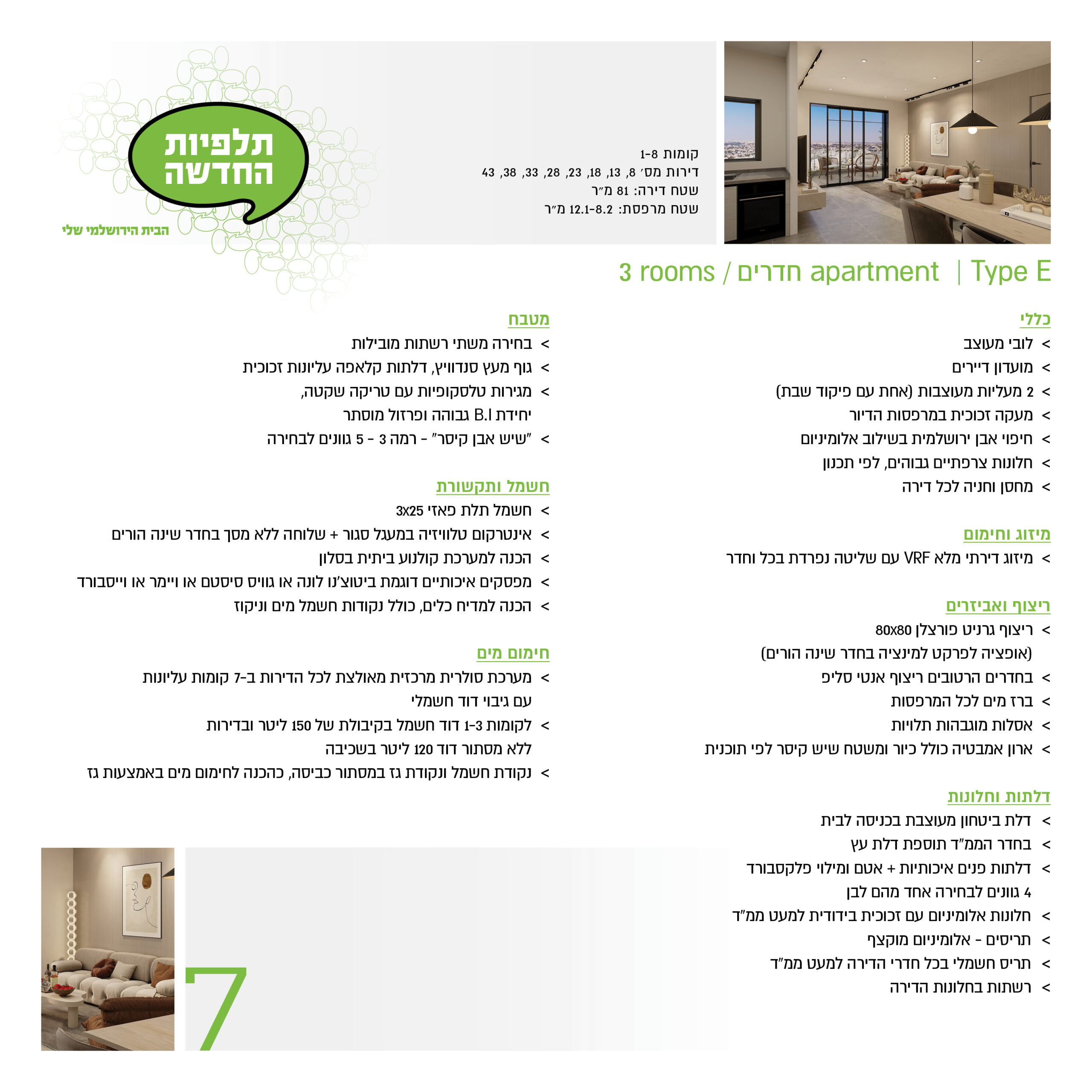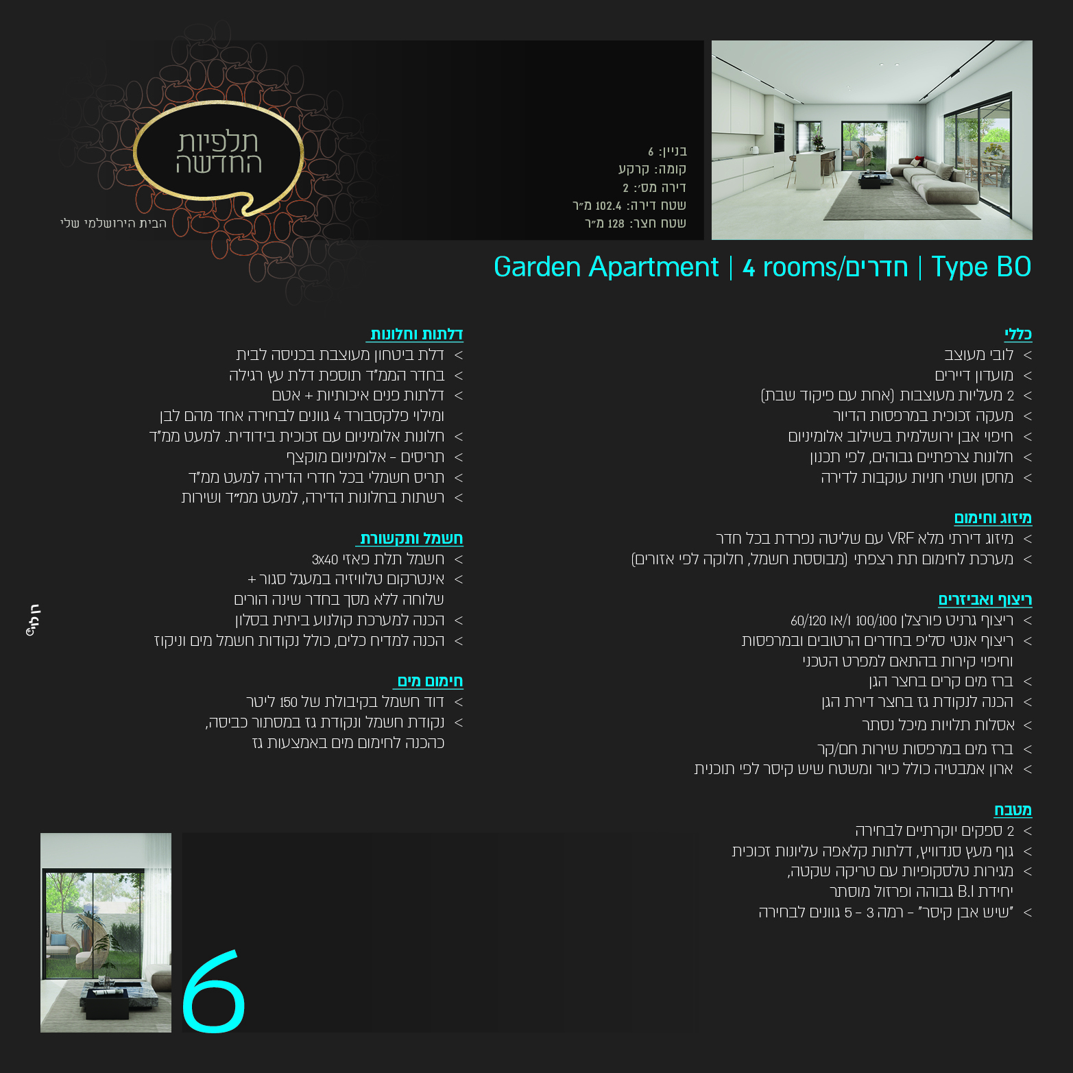 אנו שמחים להזמין אתכם להצטרף לפרויקט תלפיות החדשה שלב ב', שתוכנן ע"י משרד אדריכלים בינלאומי מן שנער ולהצטרף לקהילת דיירים איכותית ומגובשת המתגוררת בשלב א' של הפרויקט. דיירי הפרויקט יהנו מלובי מפואר שעוצב ע"י אדריכל בינלאומי ניר פורטל, חניה מקורה, ומחסנים. בלב הפרויקט יוקם פארק ירוק הכולל מתקני משחקים, וכן STREET MALL יוקרתי. בפרויקט 8 בניינים מרהיבים ובהן דירות 2-5 חד', דירות גן, מיני פנטהאוזים, פנטהאוזים, 4 בניינים בשלב א' כבר אוכלסו, שלבב' של הפרויקט 2 בניינים – עכשיו בשיווק.