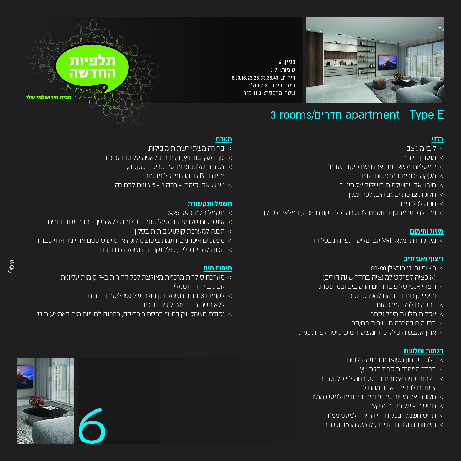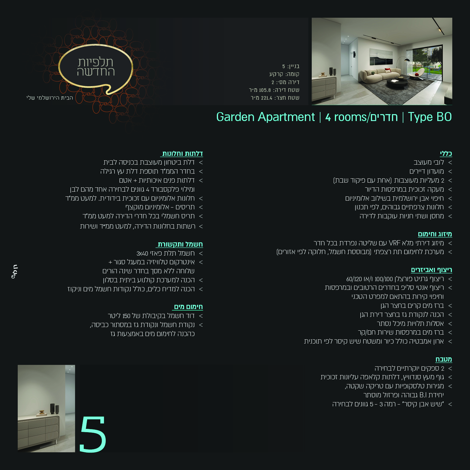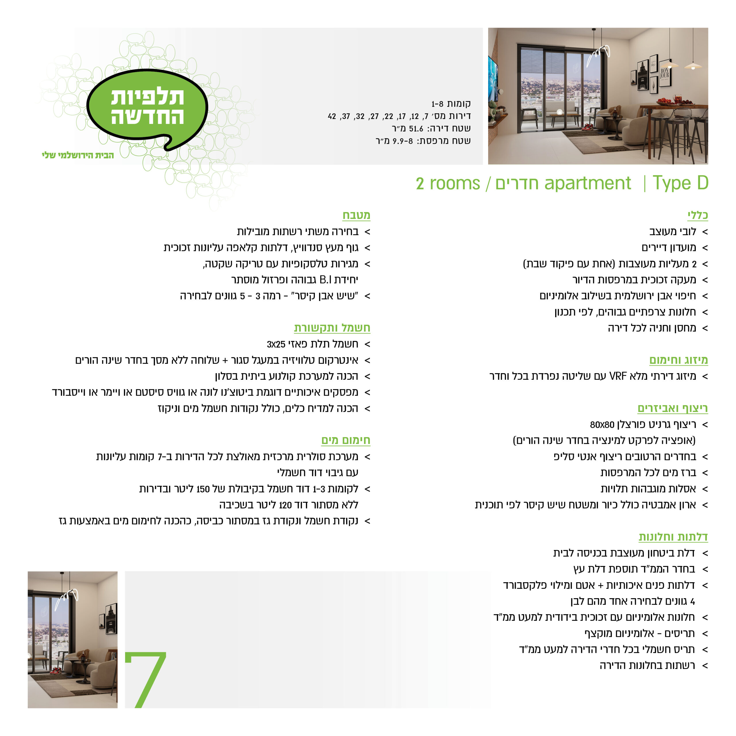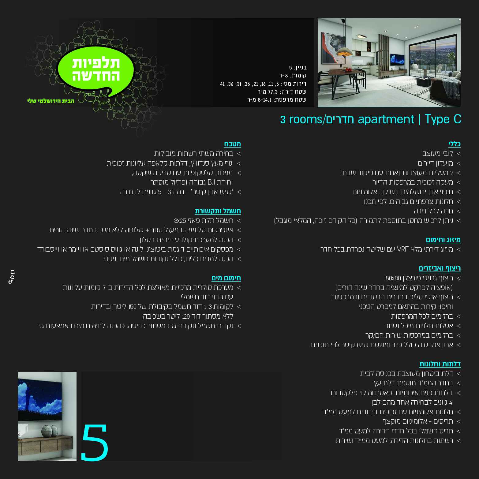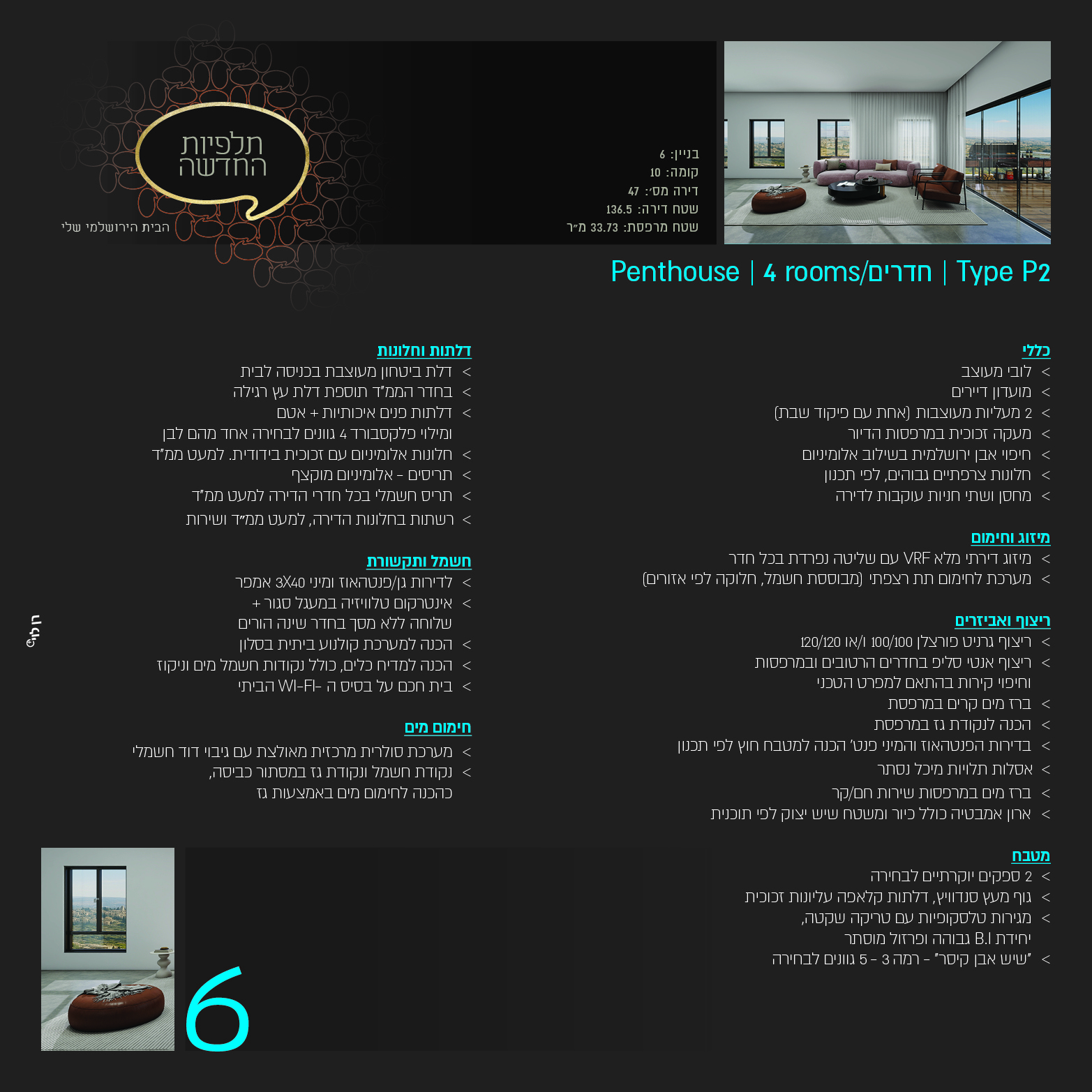 אנו שמחים להזמין אתכם להצטרף לפרויקט תלפיות החדשה שלב ב', שתוכנן ע"י משרד אדריכלים בינלאומי מן שנער ולהצטרף לקהילת דיירים איכותית ומגובשת המתגוררת בשלב א' של הפרויקט. דיירי הפרויקט יהנו מלובי מפואר שעוצב ע"י אדריכל בינלאומי ניר פורטל, חניה מקורה, ומחסנים. בלב הפרויקט יוקם פארק ירוק הכולל מתקני משחקים, וכן STREET MALL יוקרתי. בפרויקט 8 בניינים מרהיבים ובהן דירות 2-5 חד', דירות גן, מיני פנטהאוזים, פנטהאוזים, 4 בניינים בשלב א' כבר אוכלסו, שלבב' של הפרויקט 2 בניינים – עכשיו בשיווק.