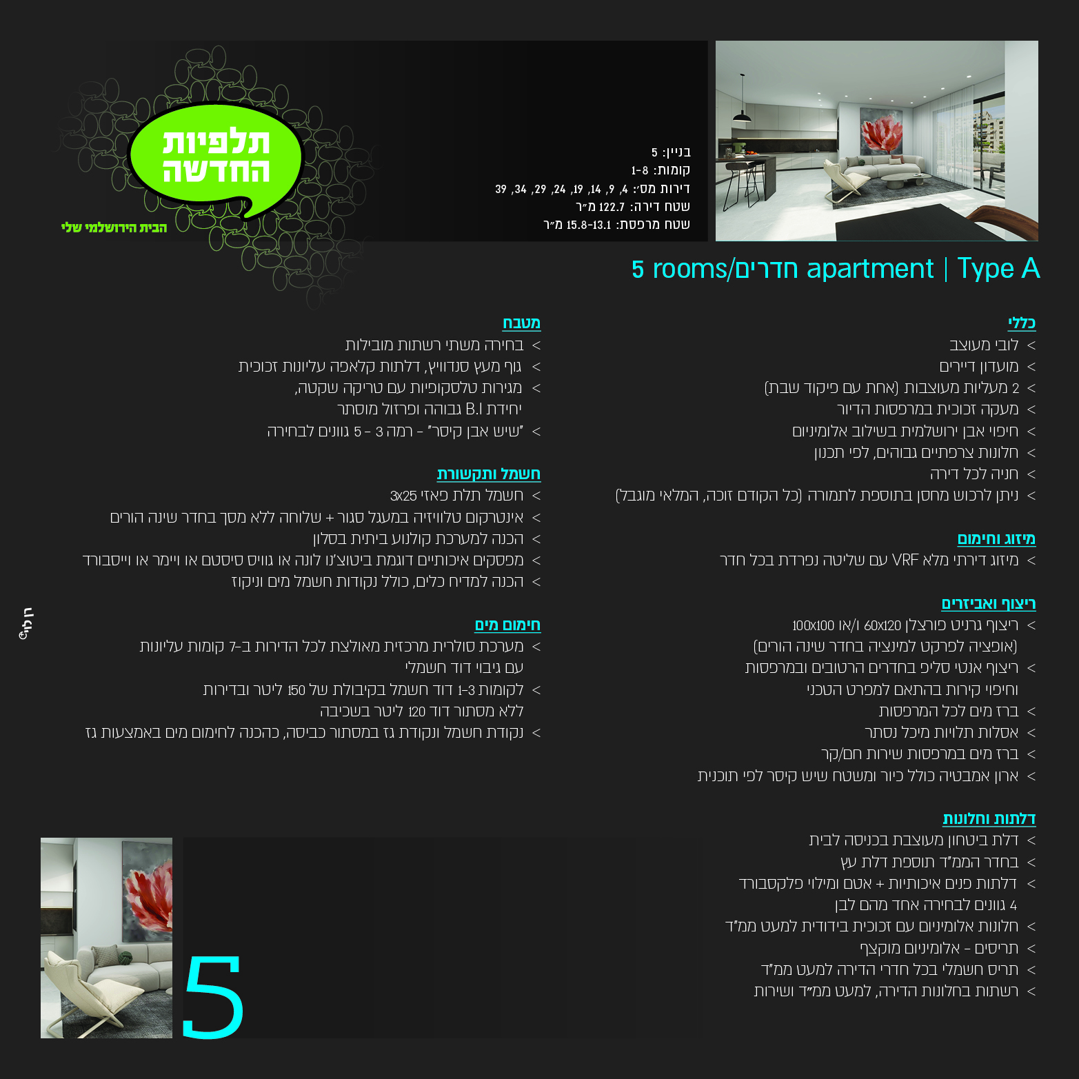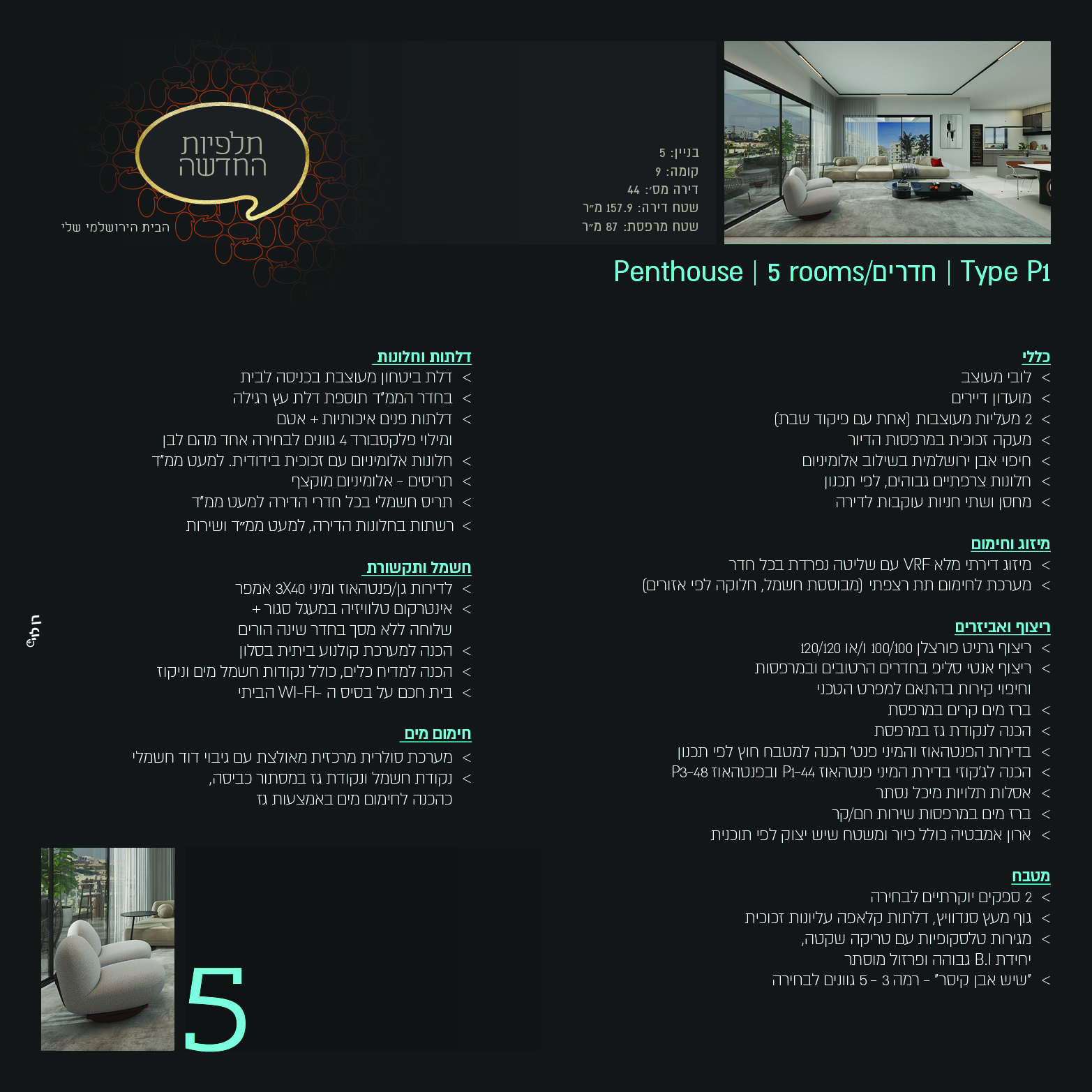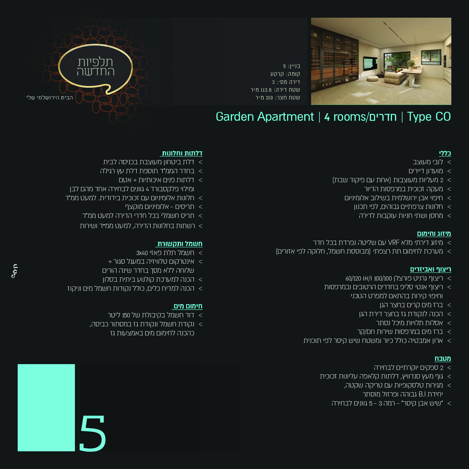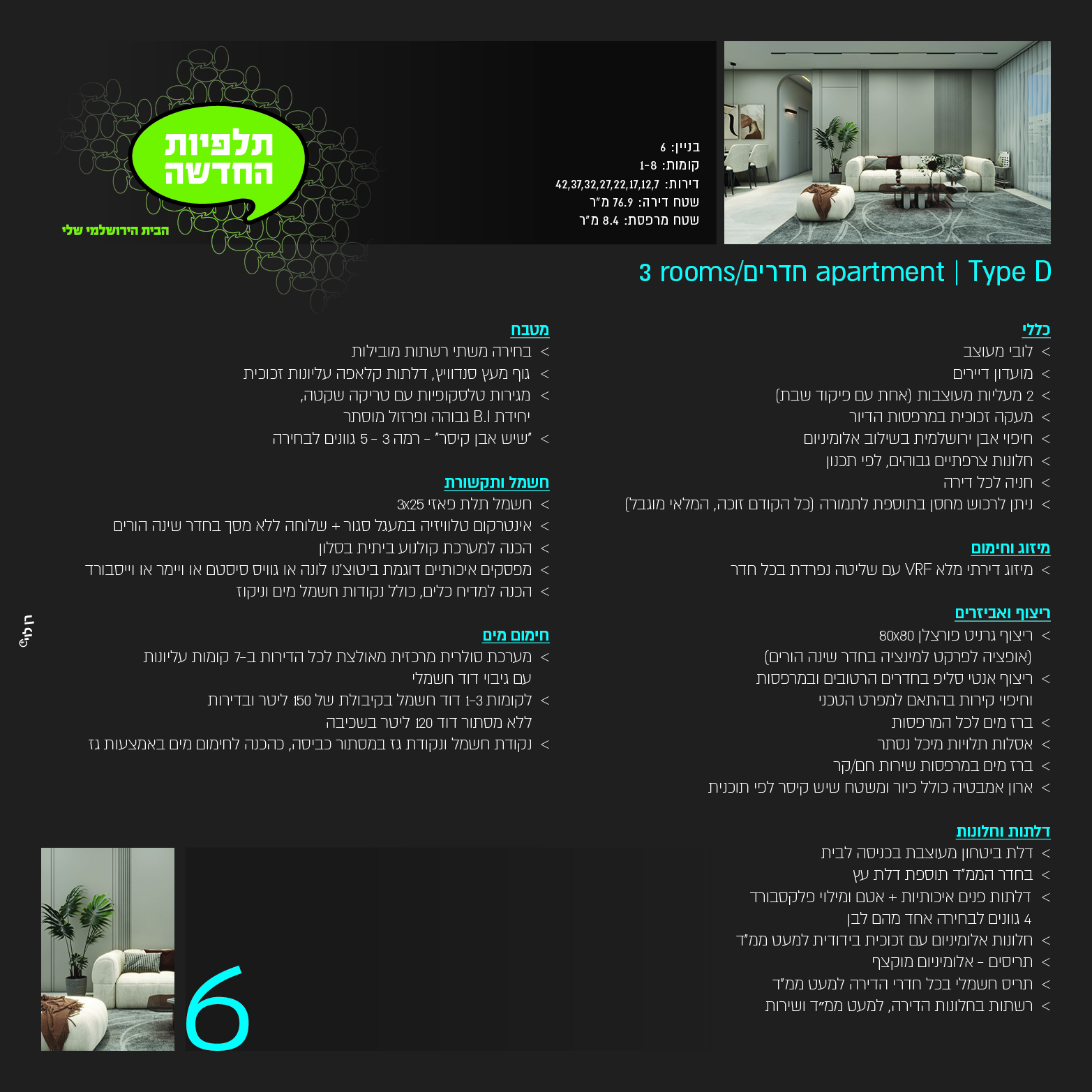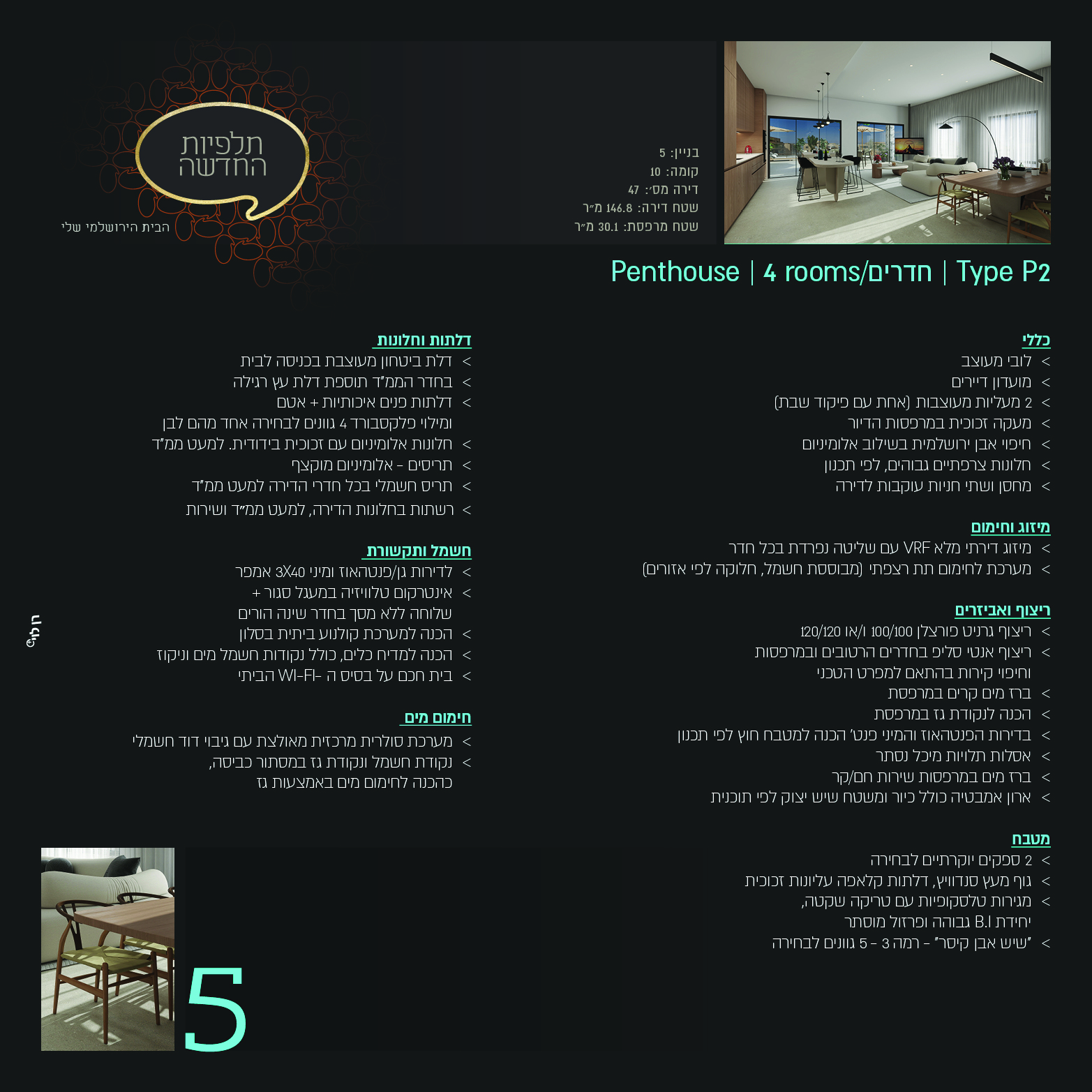 אנו שמחים להזמין אתכם להצטרף לפרויקט תלפיות החדשה שלב ב', שתוכנן ע"י משרד אדריכלים בינלאומי מן שנער ולהצטרף לקהילת דיירים איכותית ומגובשת המתגוררת בשלב א' של הפרויקט. דיירי הפרויקט יהנו מלובי מפואר שעוצב ע"י אדריכל בינלאומי ניר פורטל, חניה מקורה, ומחסנים. בלב הפרויקט יוקם פארק ירוק הכולל מתקני משחקים, וכן STREET MALL יוקרתי. בפרויקט 8 בניינים מרהיבים ובהן דירות 2-5 חד', דירות גן, מיני פנטהאוזים, פנטהאוזים, 4 בניינים בשלב א' כבר אוכלסו, שלבב' של הפרויקט 2 בניינים – עכשיו בשיווק.
