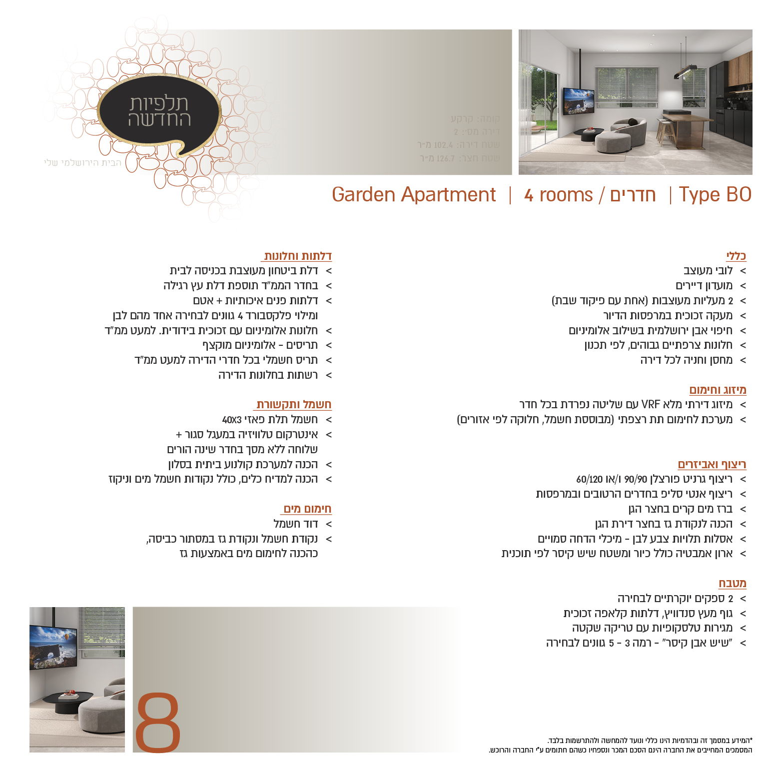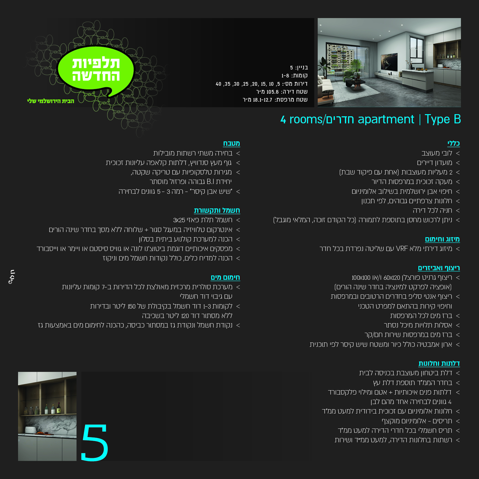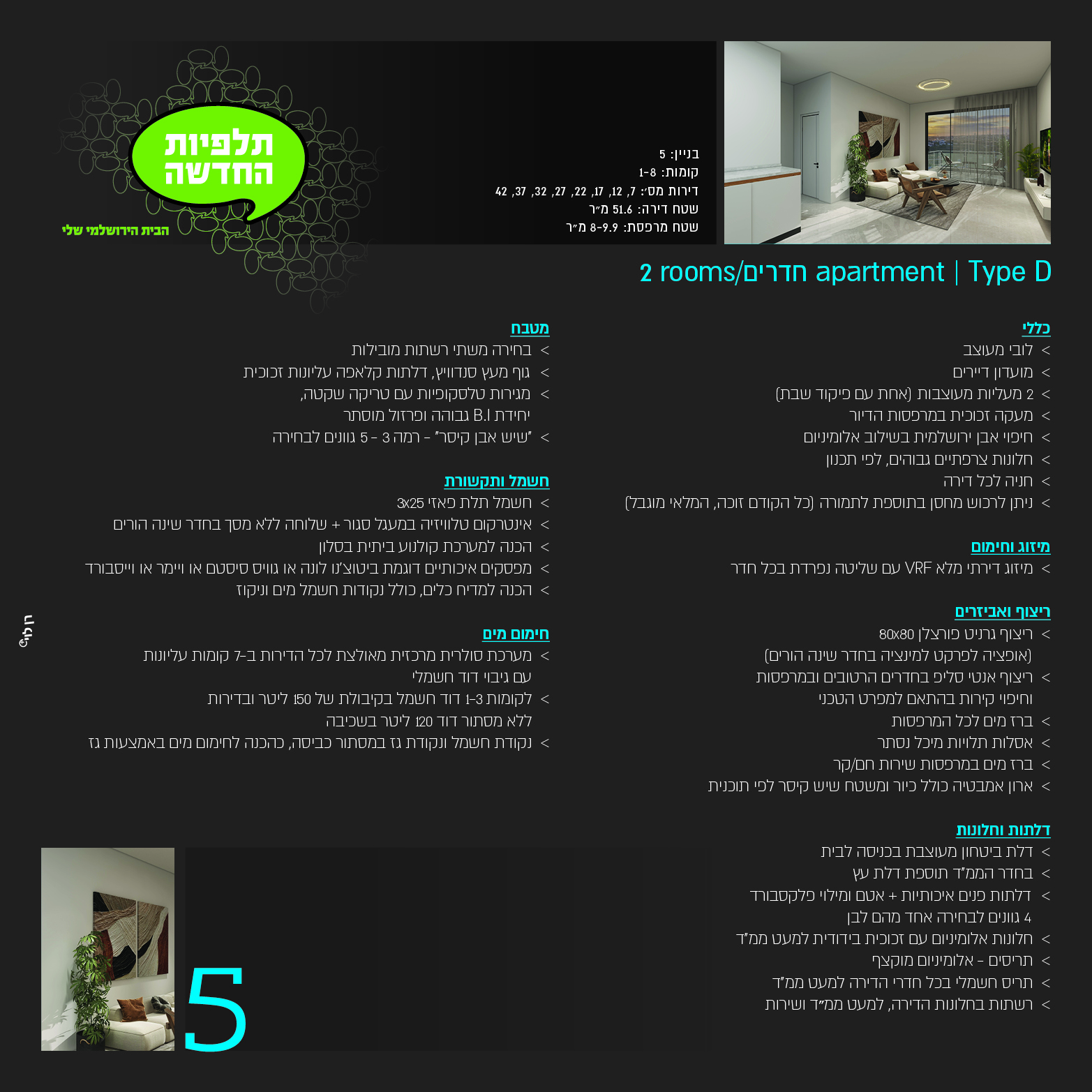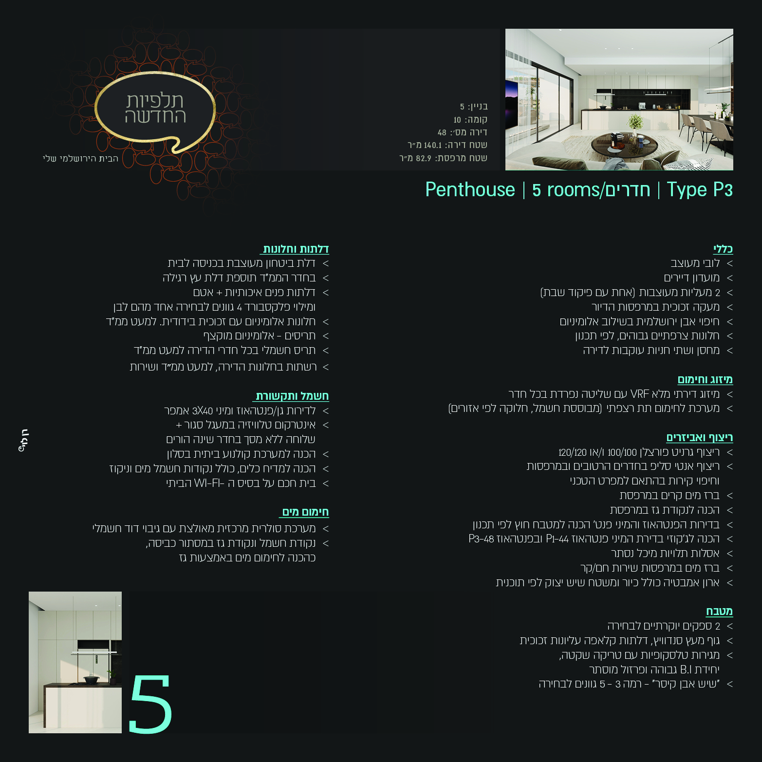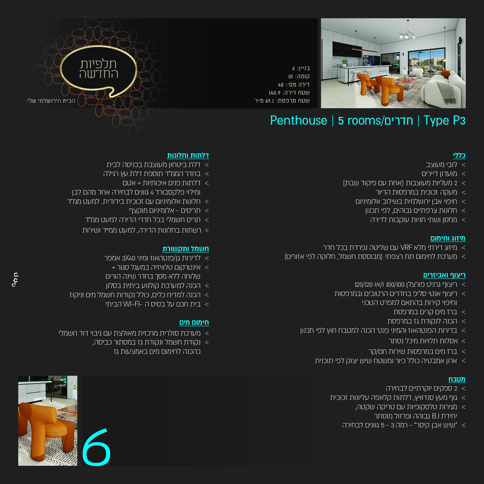אנו שמחים להזמין אתכם להצטרף לפרויקט תלפיות החדשה שלב ב', שתוכנן ע"י משרד אדריכלים בינלאומי מן שנער ולהצטרף לקהילת דיירים איכותית ומגובשת המתגוררת בשלב א' של הפרויקט. דיירי הפרויקט יהנו מלובי מפואר שעוצב ע"י אדריכל בינלאומי ניר פורטל, חניה מקורה, ומחסנים. בלב הפרויקט יוקם פארק ירוק הכולל מתקני משחקים, וכן STREET MALL יוקרתי. בפרויקט 8 בניינים מרהיבים ובהן דירות 2-5 חד', דירות גן, מיני פנטהאוזים, פנטהאוזים, 4 בניינים בשלב א' כבר אוכלסו, שלבב' של הפרויקט 2 בניינים – עכשיו בשיווק.